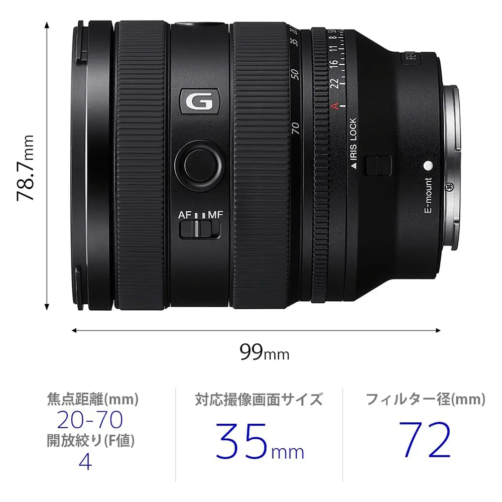 画質やAF性能、動画向けの操作性を妥協せず、小型・軽量ながら超広角20mmから70mmまでの広い焦点距離をカバー。静止画・動画を問わず、風景からポートレートなど幅広い撮影領域で活躍する開放F値4のフルサイズ対応標準ズームレンズです。