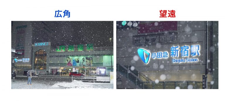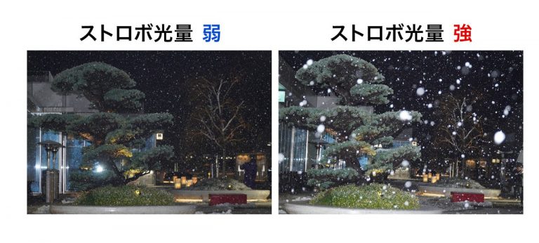 焦点距離や、ストロボの光量によっても雪の写り方が変わってきます。