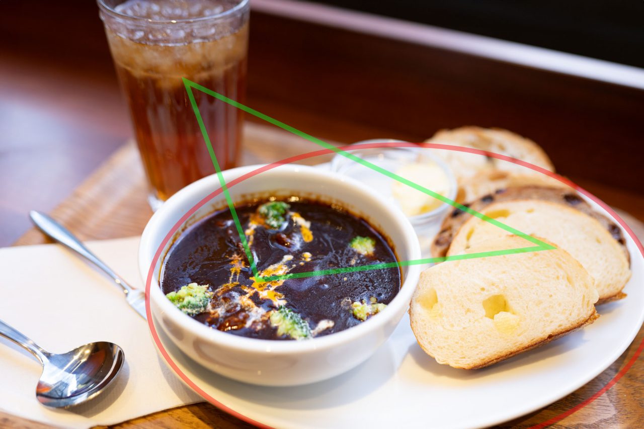 グラス・ビーフシチュー・パンを結んだ線が三角を作り、ちょうどいいバランス感を作り、料理が乗ったお皿が動きを大きくC字を作り、動きを出しています。