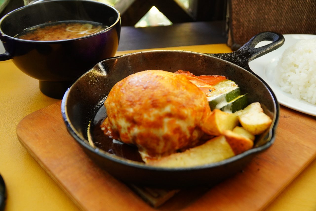 レンズ SELP18105G(広角側最短撮影距離が45cm)にて撮影。椅子に座り、料理の乗ったプレートを撮影しました。45cmよりも近づいてしまったため、メインのハンバーグではなく、フライパンの奥側にピントが合ってしまっています。