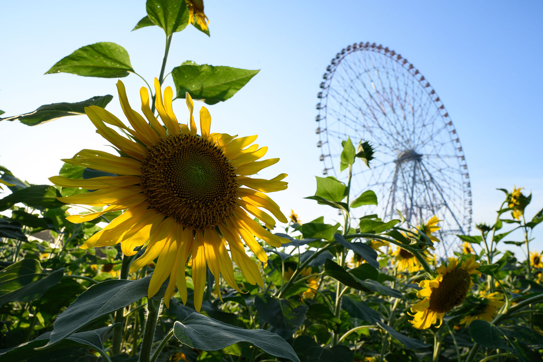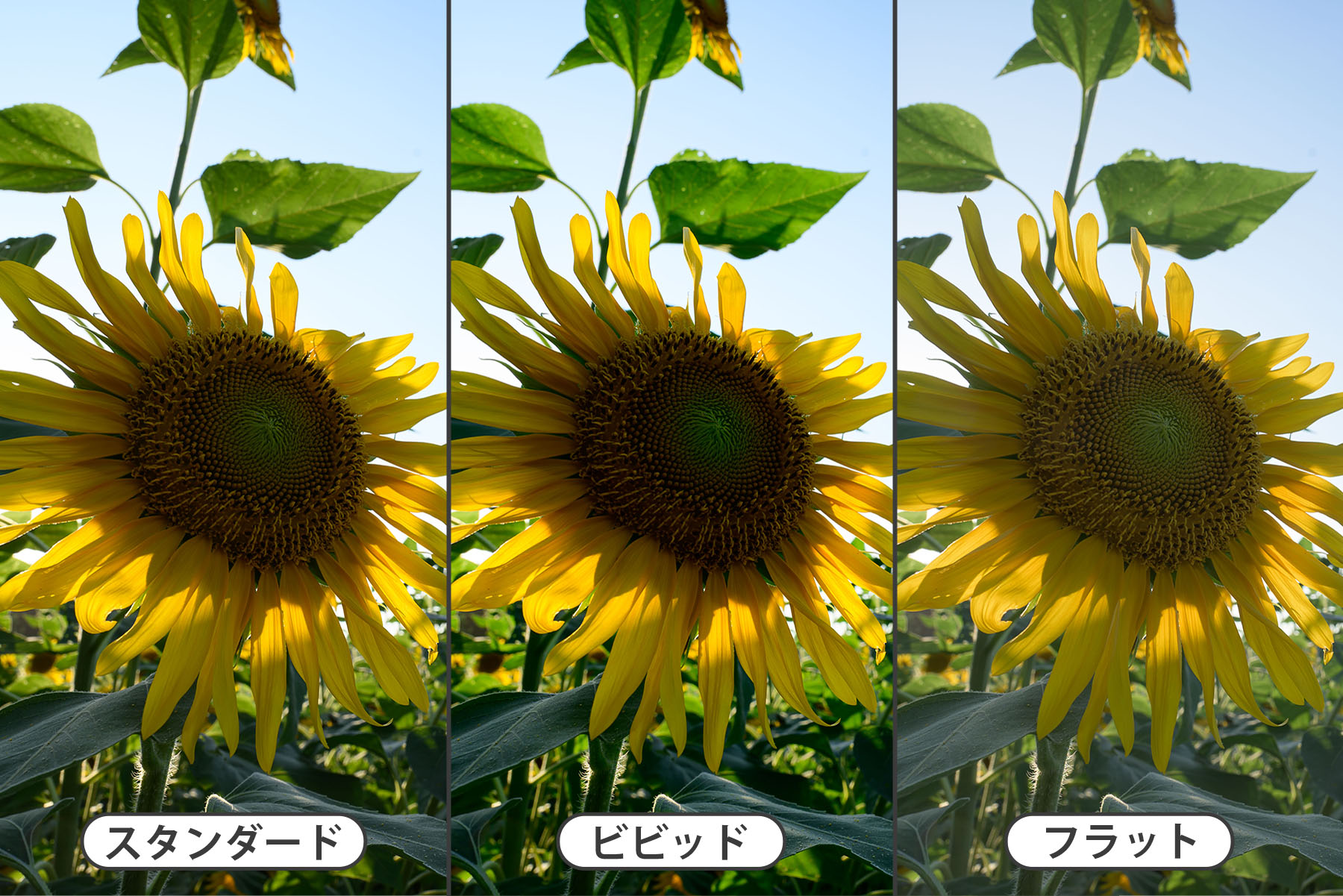 こちらは「ビビッド」にしたものです。スタンダードに比べて、ひまわりの葉の緑色や青空の色が際立っています。