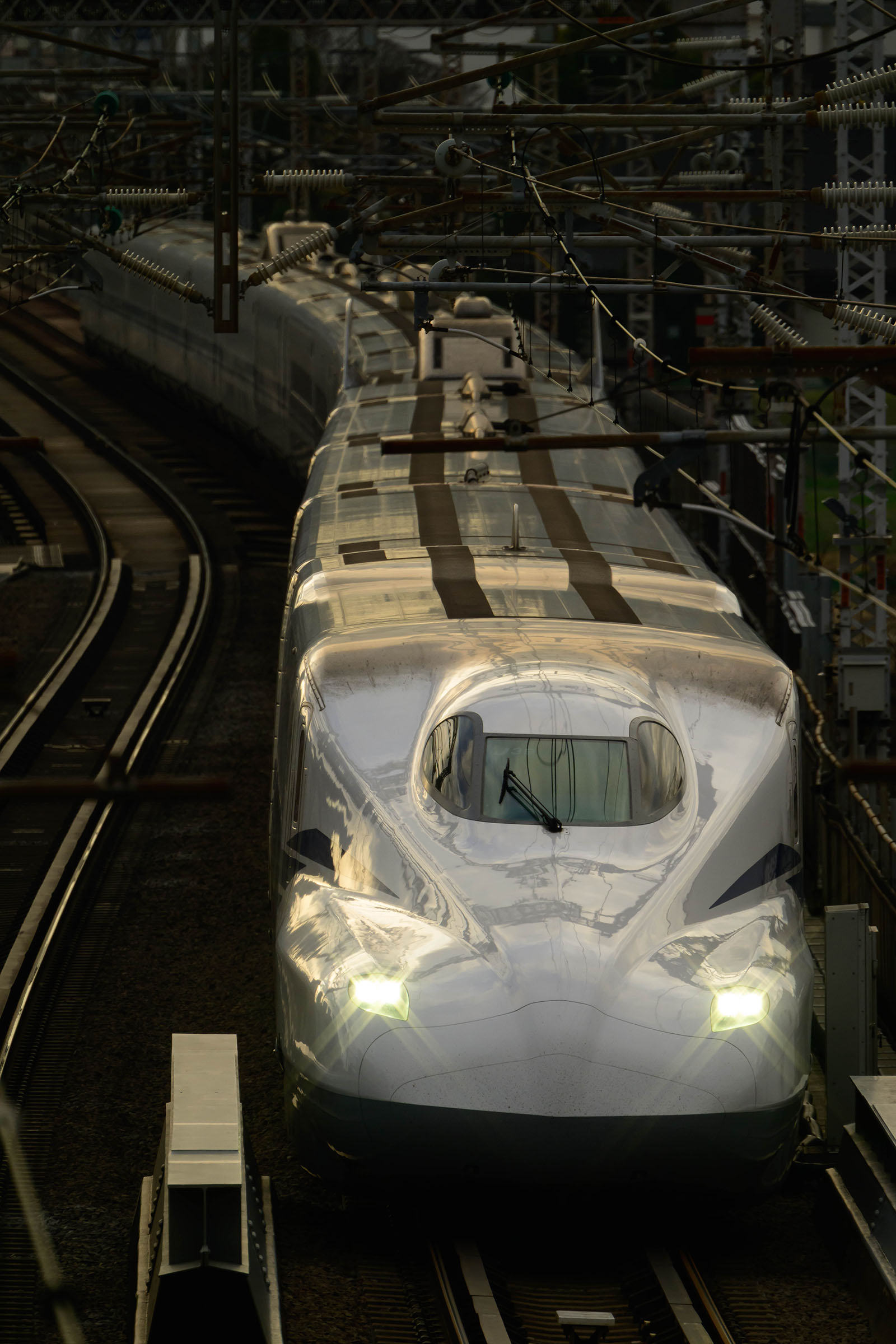陽が落ち始めてから撮影した写真なので、銀色の車体が夕陽に照らされて少しオレンジ色に傾いており、印象的な情景を醸し出しています。