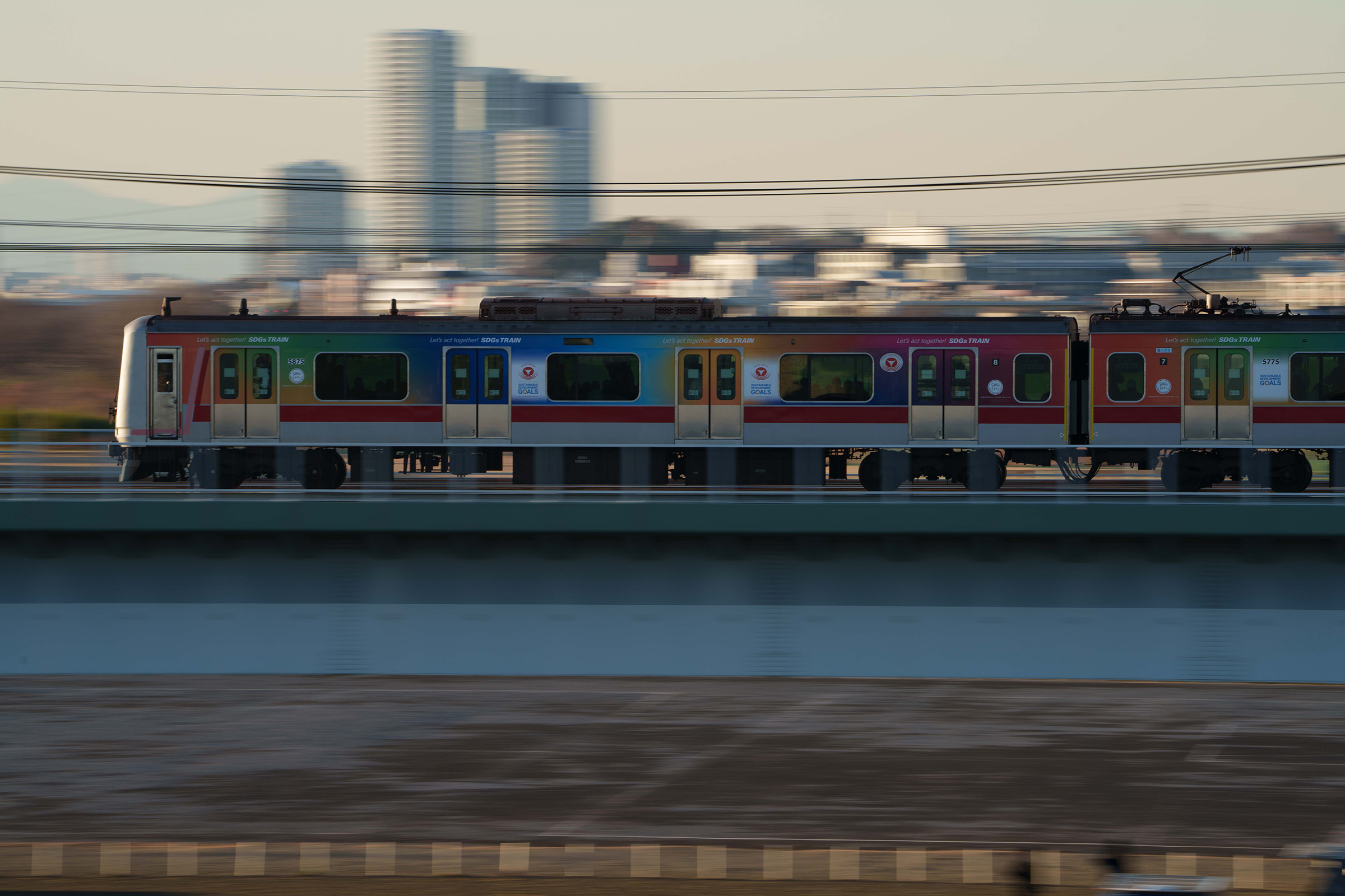 二子玉川のビル街を背景に走る「SDGsトレイン」です。