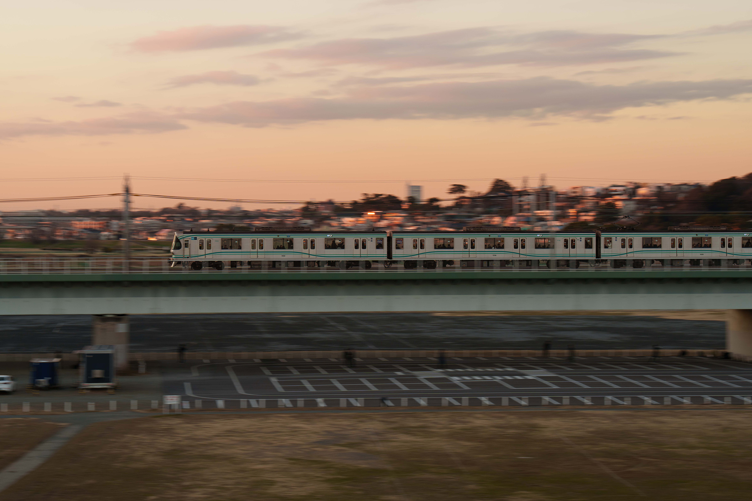 少し陽も落ち始め、夕陽が背景の住宅街に反射し印象的な情景を作り出しています。