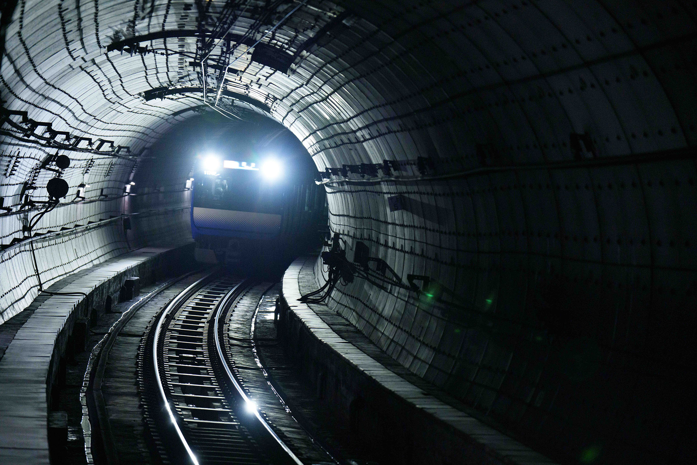 総武快速線はトンネル照明が少ないですが、列車のヘッドライトが明るく、トンネル壁面や線路が反射して独特な雰囲気を作り出すため、雰囲気がある写真を撮影するのに向いています。