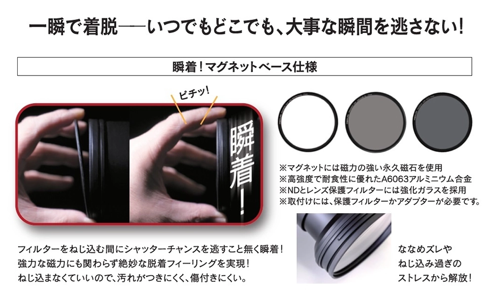 寒空の下、かじかんだ手や手袋をつけた状態で行うねじ込み式フィルターの交換は大変なもの。しかし、マルミ光機のマグネットフィルターシステム(当店ではお取り寄せ販売のみの扱い)なら瞬時に交換可能です。