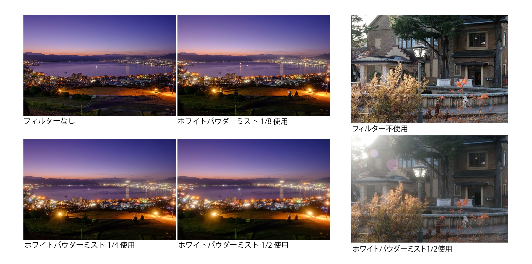 寒い夜に白い霧がかかったような柔らかな世界を表現できる、ホワイトミストNo.1はその名の通りの効果が得られます。冬の空気感にマッチしたフィルターと言えそうです。
