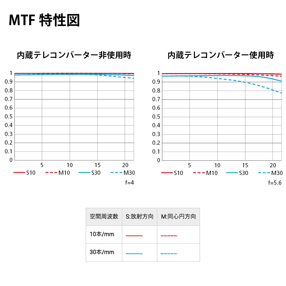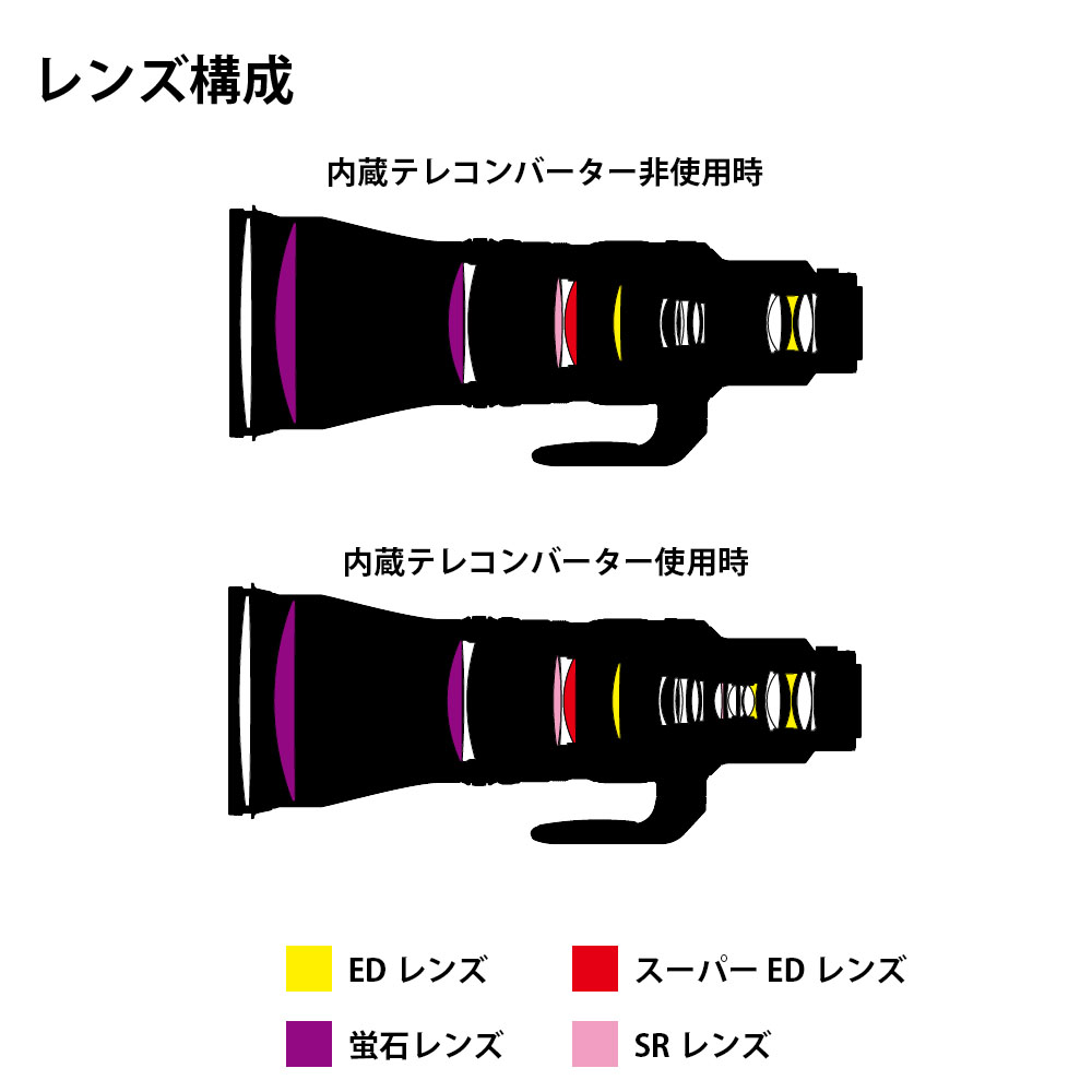 - 20群26枚(うち内蔵テレコンバーター4群7枚、EDレンズ3枚、スーパーEDレンズ1枚、蛍石レンズ2枚、SRレンズ2枚、メソアモルファスコートあり、ナノクリスタルコートあり、最前面のレンズ面にフッ素コートあり)