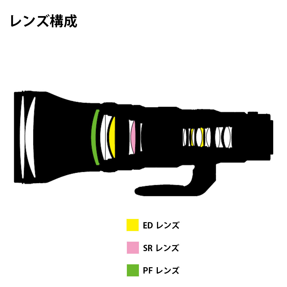 - 14群22枚(EDレンズ3枚、SRレンズ1枚、PFレンズ1枚、ナノクリスタルコートあり、最前面のレンズ面にフッ素コートあり)