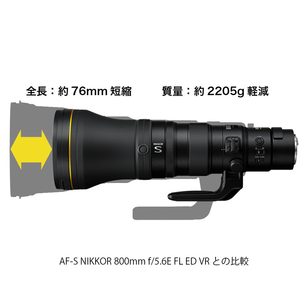 NIKKOR Z レンズの中で最長(※)の、焦点距離800mmの超望遠レンズ。高い解像感が見る者を圧倒する、迫力のある描写が得られます。NIKKOR Z レンズで初めてPF(Phase Fresnel:位相フレネル)レンズを採用し、超望遠レンズでありながら小型・軽量を実現。高い携行性を発揮します。優れた機動性により、手持ちや一脚を使用しての撮影でも、野鳥など遠くの被写体に集中でき、高い描写性能による高画質を堪能できます。