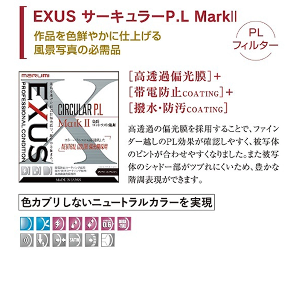 被写体の表面反射を抑え、色彩コントラストを強調する、風景写真には欠かせない円偏光フィルター「EXUS CIRCULAR P.L Mark2(エグザス サーキュラーP.Lマーク2)」。高透過の偏光膜を採用することで、ファインダー越しのPL効果が確認しやすく、被写体のピントが合わせやすくなりました。また被写体のシャドー部がツブれにくいため、豊かな階調表現ができます。従来の高透過偏光膜よりもニュートラルなカラーバランスになるよう、新たに専用設計された偏光膜を使用。