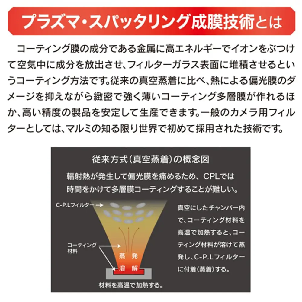 コーティング膜の成分である金属に高エネルギーでイオンをぶつけて空気中に成分を放出させ、フィルターガラス表面に堆積させるというコーティング方法です。 従来の真空蒸着に比べ、熱による偏光膜のダメージを抑えながら緻密で強く薄いコーティング多層膜が作れるほか、高い精度の製品を安定して生産できます。 一般のカメラ用フィルターとしては、マルミの知る限り世界で初めて採用された技術です。圧倒的な超低反射率0.18%