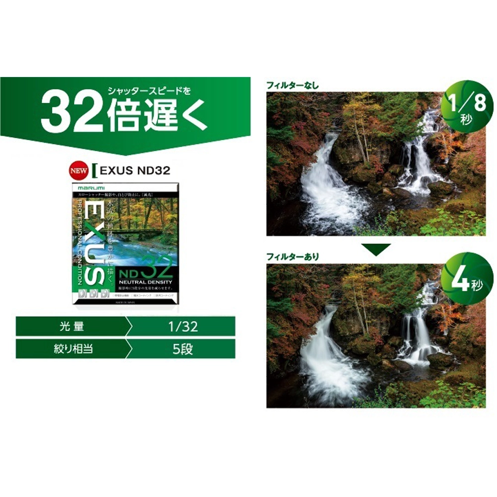 EXUS NDシリーズはニュートラル性がきわめて高く、色再現性に優れ、被写体の色彩に影響を与えることなく光量だけを減少させます。明るい場所でのスローシャッター撮影時に露出オーバー(白トビ)を防ぎ、水流を幻想的に表現する事ができます。