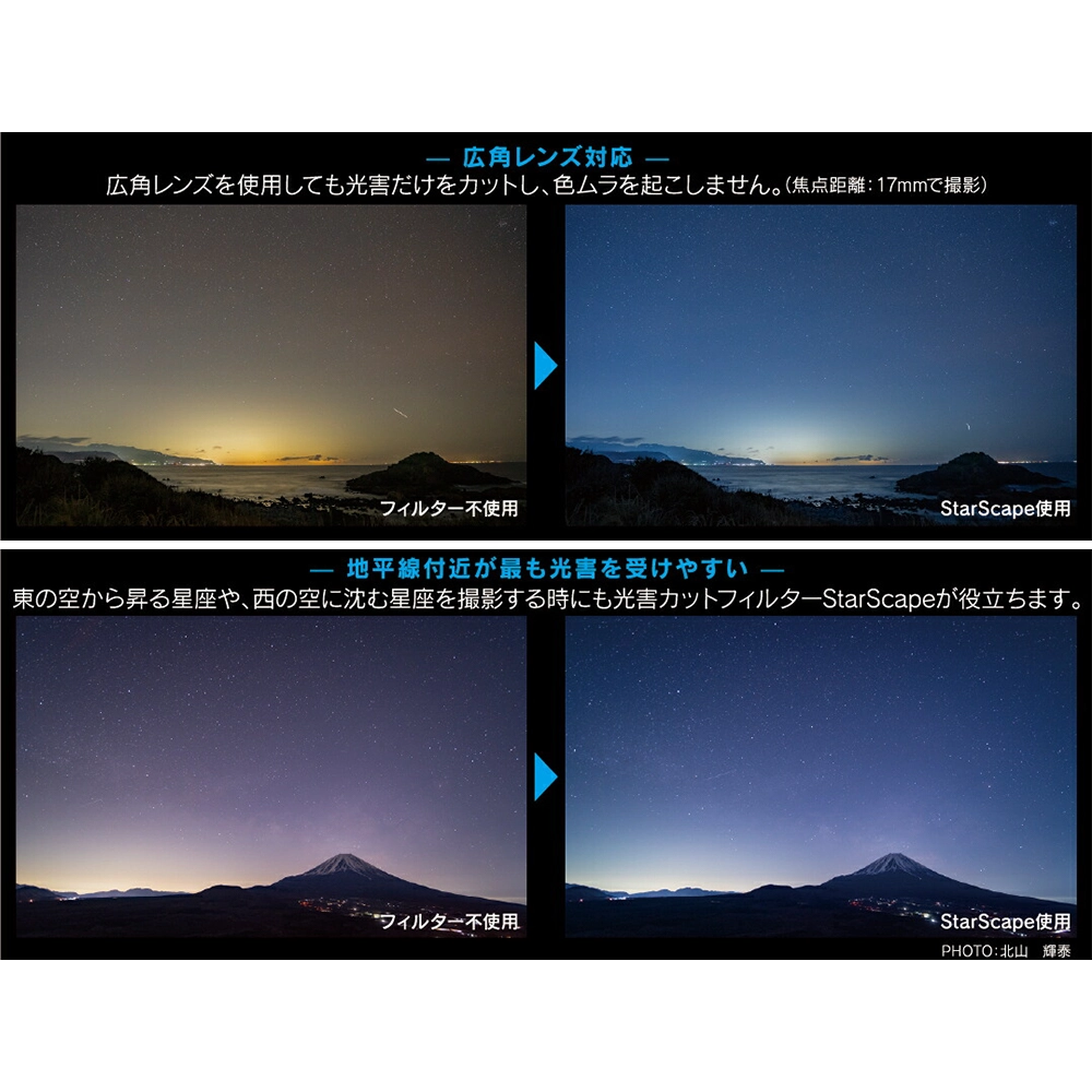 StarScapeは、マルミが独自開発した星景・夜景フィルターです。星の色を活かしながら、光害の原因となる特定の波長を効果的にカットします。最大の特徴は、光害の波長光を吸収する特殊成分をガラスに練り込む配合バランスで、「星」と「空」と「景色」のカラーバランスを最適に保ち、自然でクールな星空を表現することができます。また、コート品で発生しがちな広角レンズでの色ムラが発生しません。