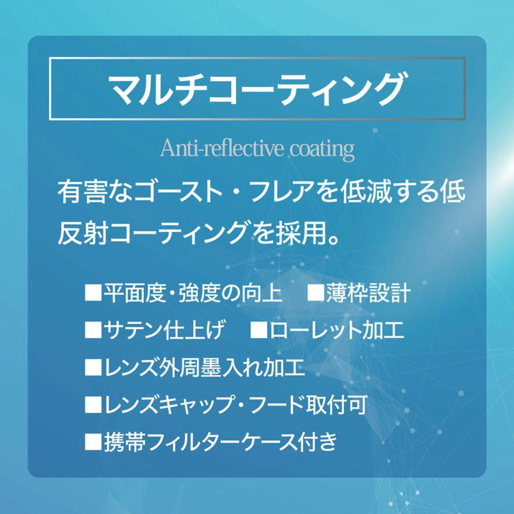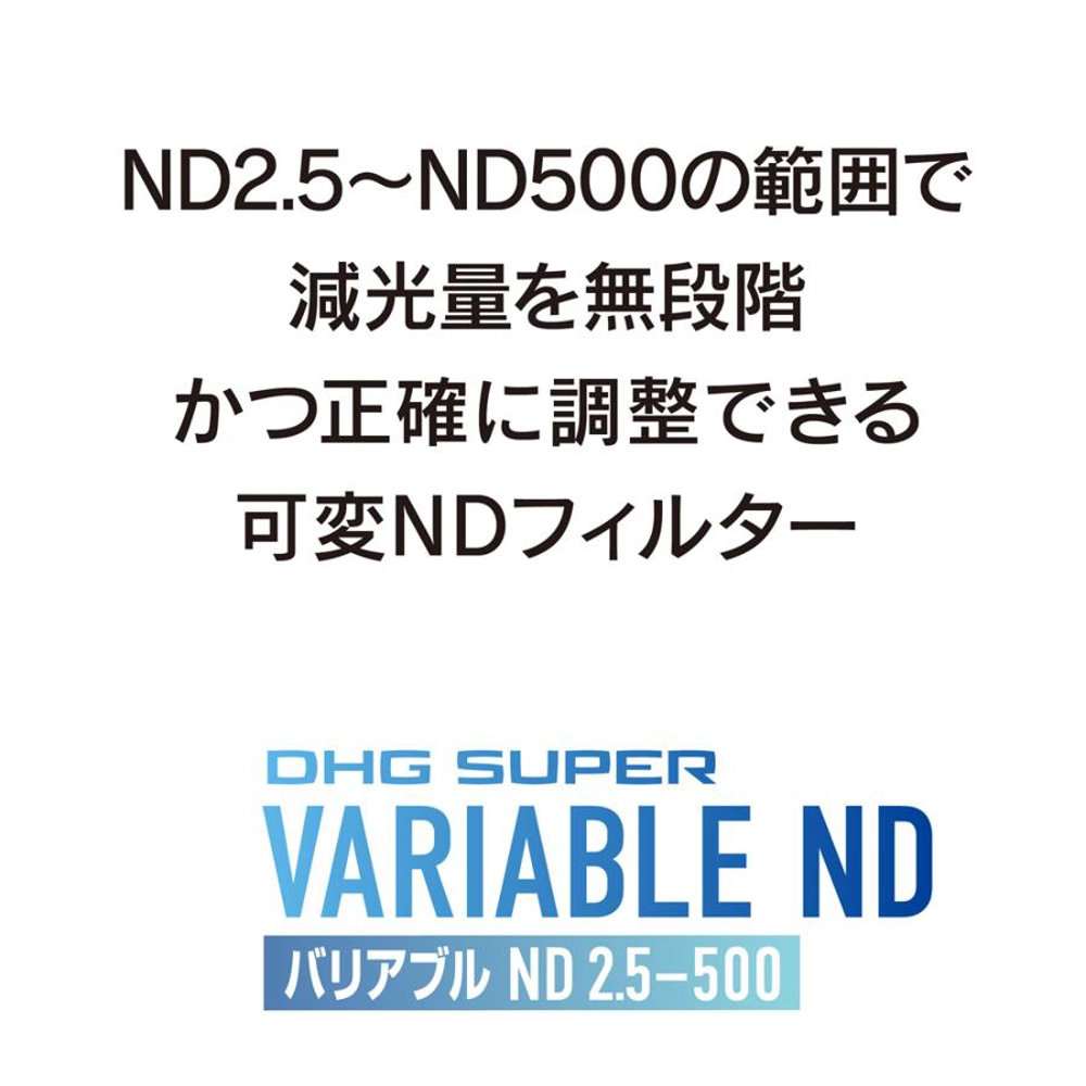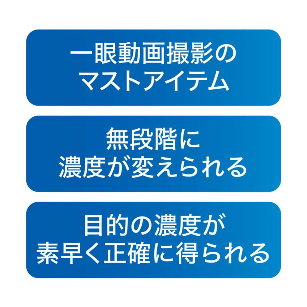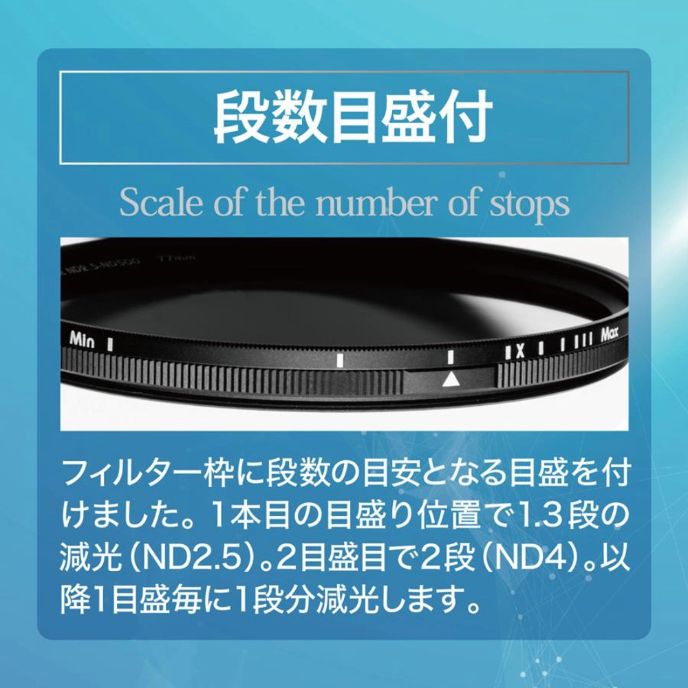 2枚の偏光膜を使い、濃度を無段階に変えることができるNDフィルターです。一眼カメラでの動画撮影や、ポートレート、風景撮影などに幅広くお使いいただけます。前枠を回転させることで減光量を調整します。撮影状況の変化に応じて適切な露出をシームレスに得ることができます。また減光量の目安となる段数目盛を付けることで、目的の濃度を素早く正確に設定できて便利です。初めてお求めになる方にも、安心してご使用いただけます。