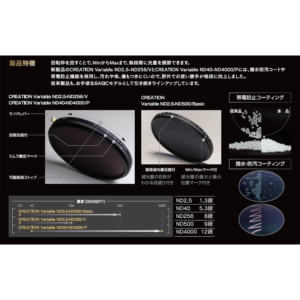 2枚の偏光膜を使った減光フィルターです。回転枠を回すことで、MinからMaxまで、無段階に光量を調節できます。撥水防汚コートや帯電防止機能を採用し、汚れや埃、傷もつきにくいので、野外での使い勝手が格段に向上しました。