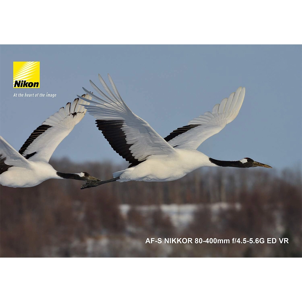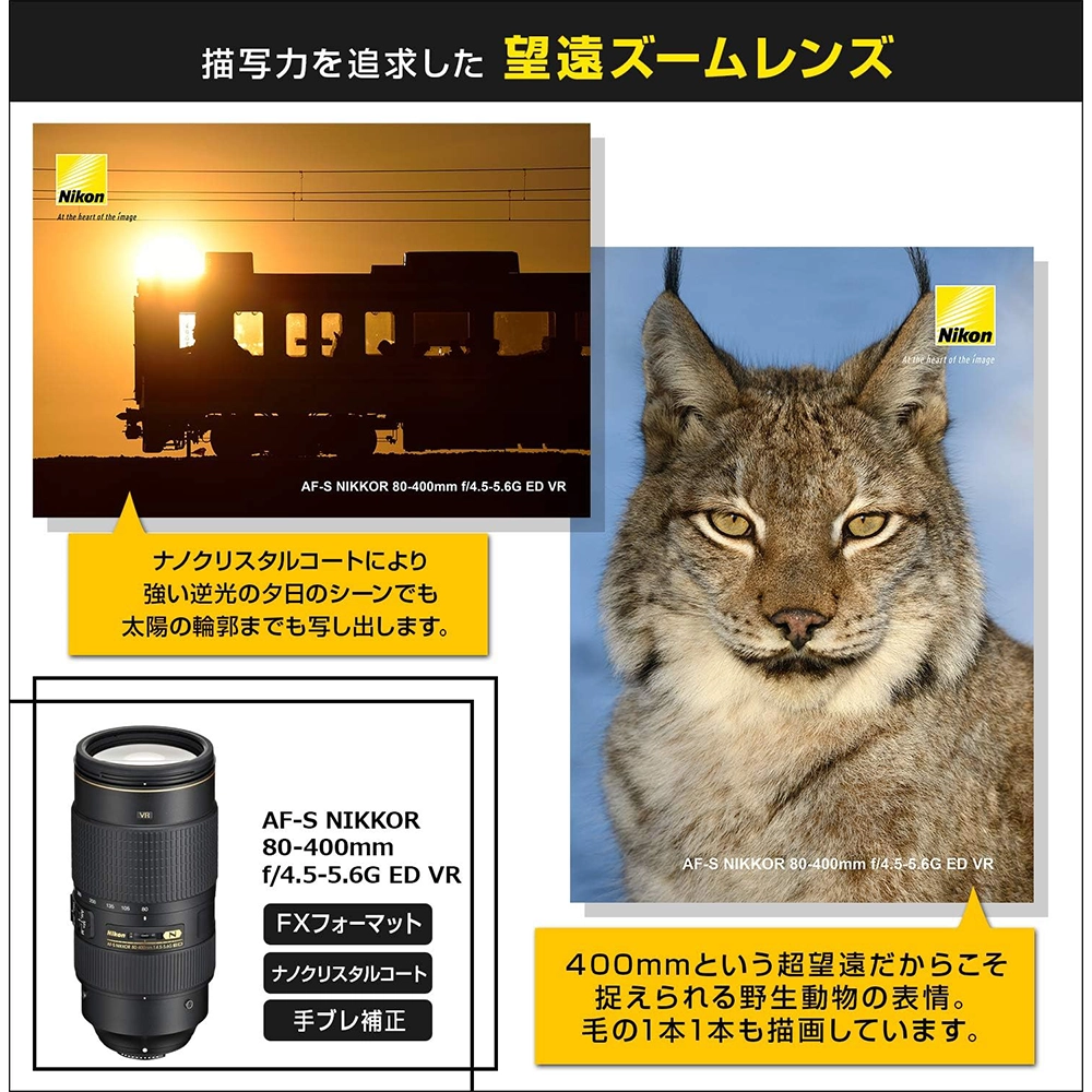 VR機構を搭載した、焦点距離80-400mm(DXフォーマットデジタル一眼レフカメラ装着時、35mm判換算で焦点距離120-600mmレンズの画角に相当)の5倍望遠ズームレンズ。幅広い画角をカバーし、野鳥から野生動物、スポーツ、鉄道、飛行機など、これ1本で多彩な望遠撮影が楽しめます。「A/M」(オート優先オートフォーカス)、「M/A」(マニュアル優先オートフォーカス)、「M」(マニュアルフォーカス)の3つのフォーカスモードを搭載し、操作性を向上。また、AF-S TELECONVERTER TC-14 IIIをF8対応のカメラに装着して併用することで焦点距離を560mmに拡大でき、ズーム全域でAFが使用できます。