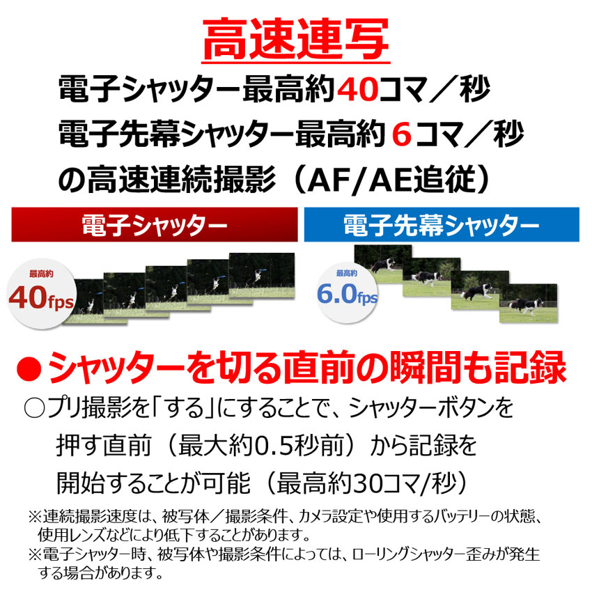 - 高速連続撮影+:最高約6.0コマ/秒(電子先幕)、最高約40コマ/秒(電子シャッター)