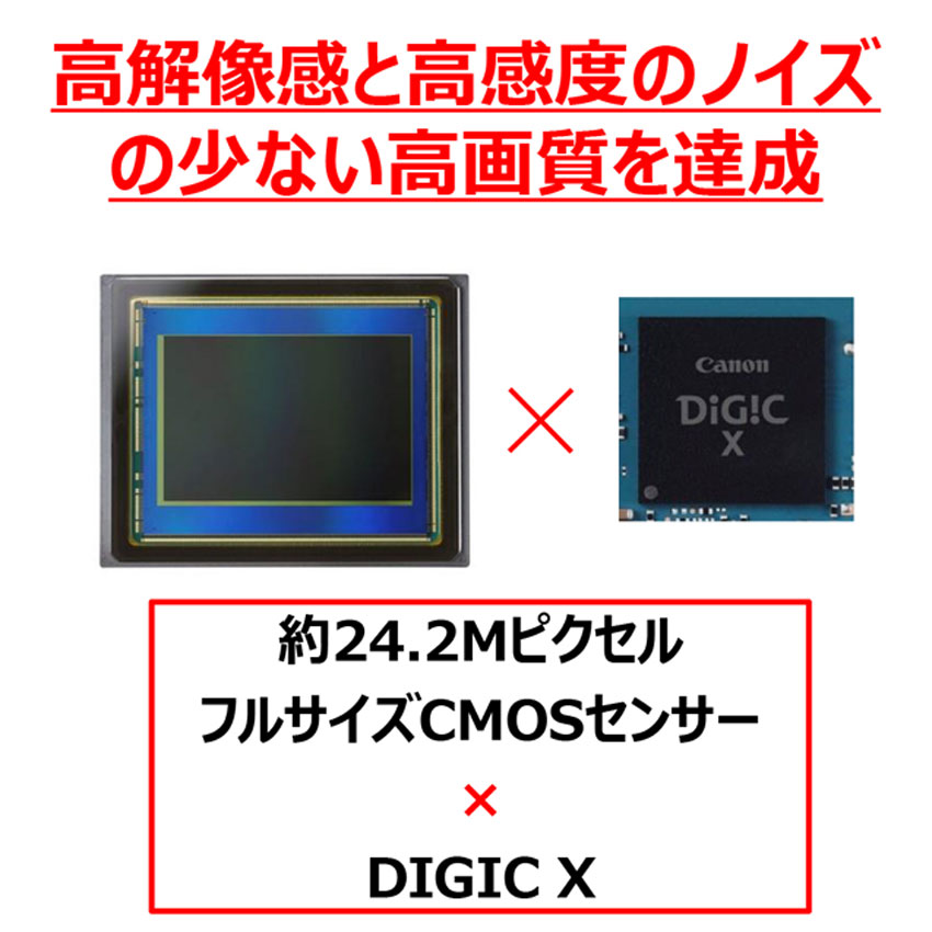 有効画素数最大約2420万画素35mmフルサイズCMOSセンサーを搭載。受光面積が広く、色彩のグラデーションを鮮明に再現でき、美しく大きなボケ味が得られます。新たなシャープネス処理により、被写体のディテールを高い解像感で描写。映像エンジンDIGIC Xとの組み合わせで、高画質と高感度の両立も実現しています。静止画撮影時の常用ISO感度は100~102400。