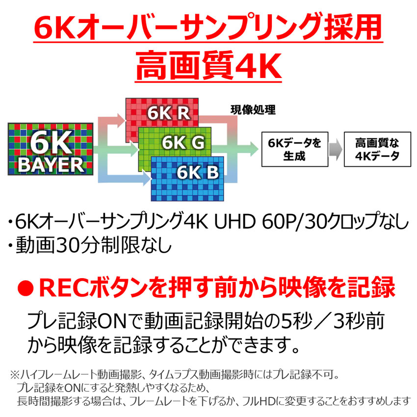RGBそれぞれを6Kサイズで記録し、合わせて1フレームを生成したのち、4Kにリサイズする6Kオーバーサンプリング撮影が可能。より高画質で、優れた解像感の4Kムービーを撮影できます。動画撮影時は常用ISO感度25600。4Kムービー撮影時でも、ノイズを抑えたクリアで高画質な動画を撮影できます。