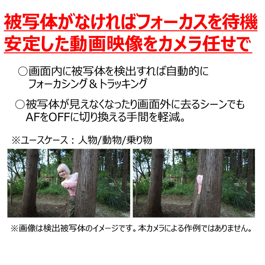 ディープラーニング技術を活用したトラッキングシステムEOS iTR AF Xで人物/動物/乗り物に対して高精度に検出、トラッキングします。被写体をすばやくつかみ、激しく動き回ってもしっかりとピントを合わせ続けます。被写体の姿勢や明るさが変化しても、粘り強く追尾します。