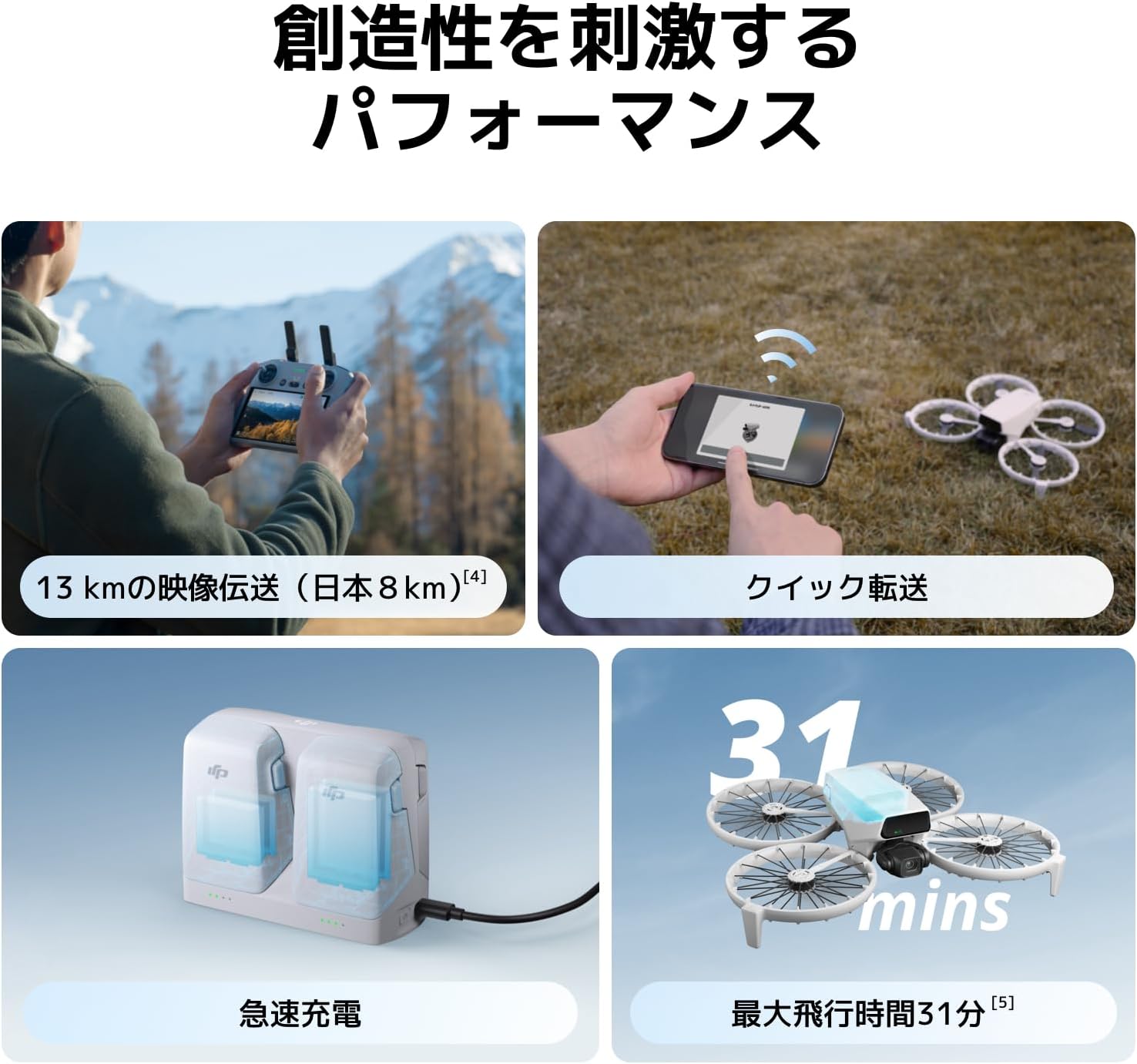 | 最大飛行時間 | 31分 ※無風、海抜20 m、高度6 m/s、写真モードで測定。実際は環境や使用条件で変動。 |
