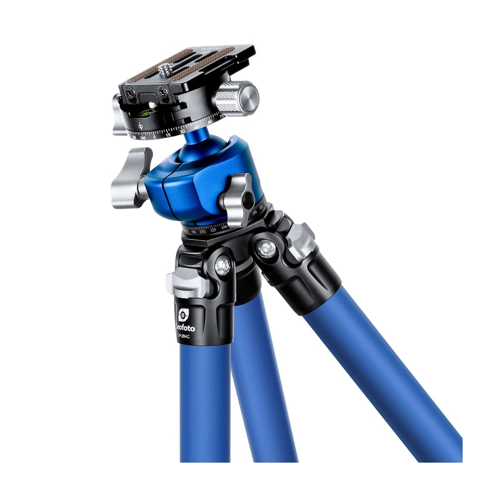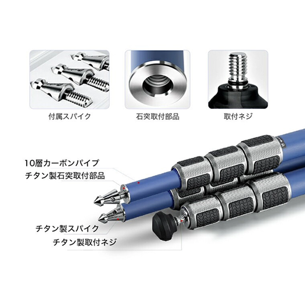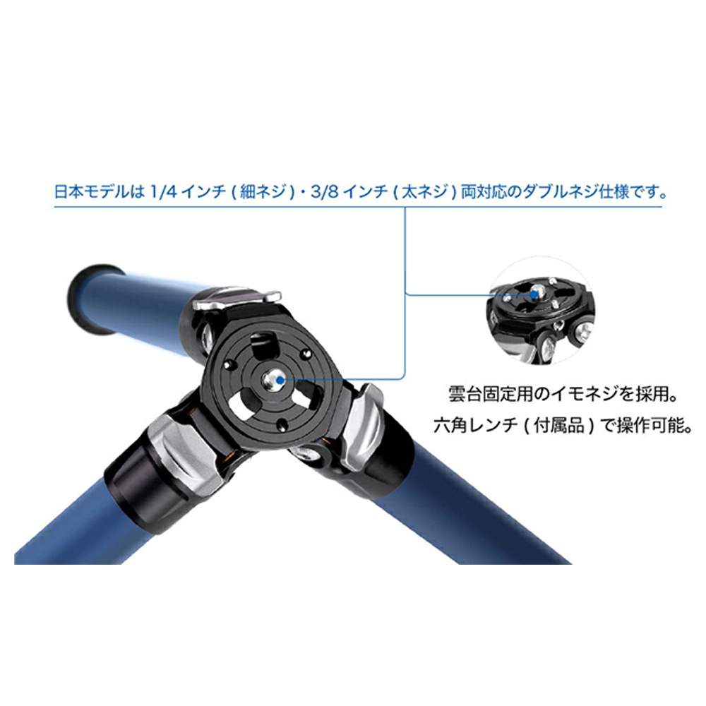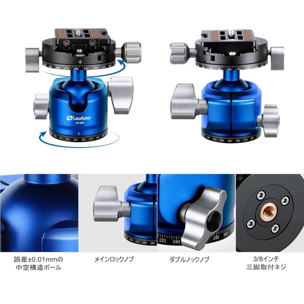 鮮やかな青色の塗装を三脚と雲台、両方に施したフルブルーモデル。 脚部は業界初の技術で塗装された鮮やかな青色が全段に施され、キズや耐摩耗性にも優れています。さらに、新開発の浸水防止機構を備え、チタン製のパーツを採用し腐食への耐性を高めるなど、タフな造りと小型・軽量を両立したモデルです。セットの雲台「LH-30R(BL)」は鮮やかな青色が印象的。天面でのパンニングが可能です。