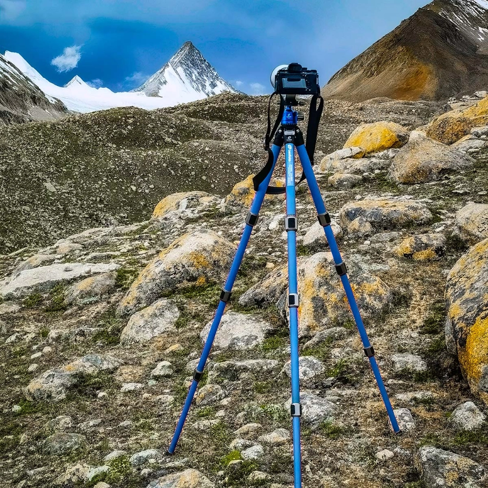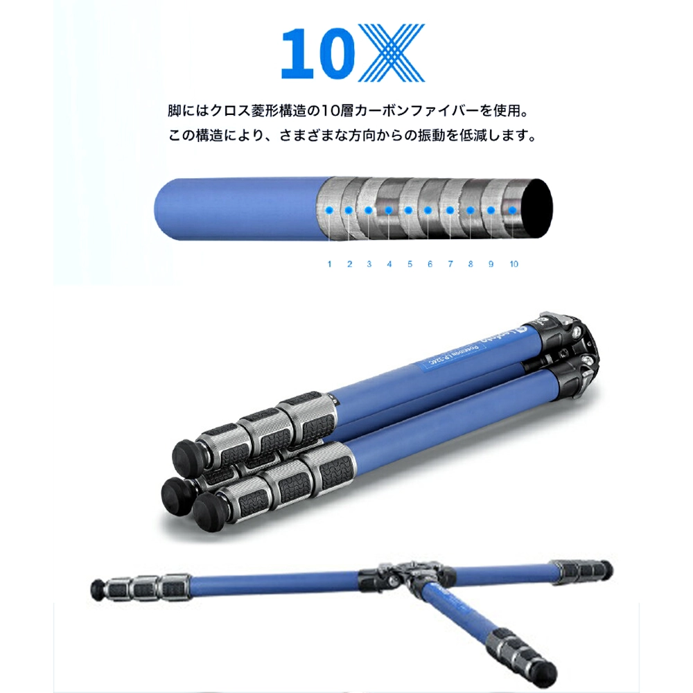 脚にはクロス菱形構造の10層カーボンファイバーを使用しているため、様々な方向からの振動を軽減。また、センターポールを取り除いたデザインにより、非常に小さく収納することが可能です。センターポールの干渉がないため、地面に近いアングルでの撮影ができます。