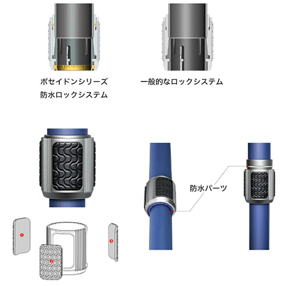 ?※ポセイドンシリーズの防水機能は脚内部への浸水を防止し、メンテナンスの手間を軽減するものです。本体部分や付属雲台は他シリーズと同仕様のため、脚部以外が濡れた場合、固定力や動作など性能が落ちる可能性がございます。