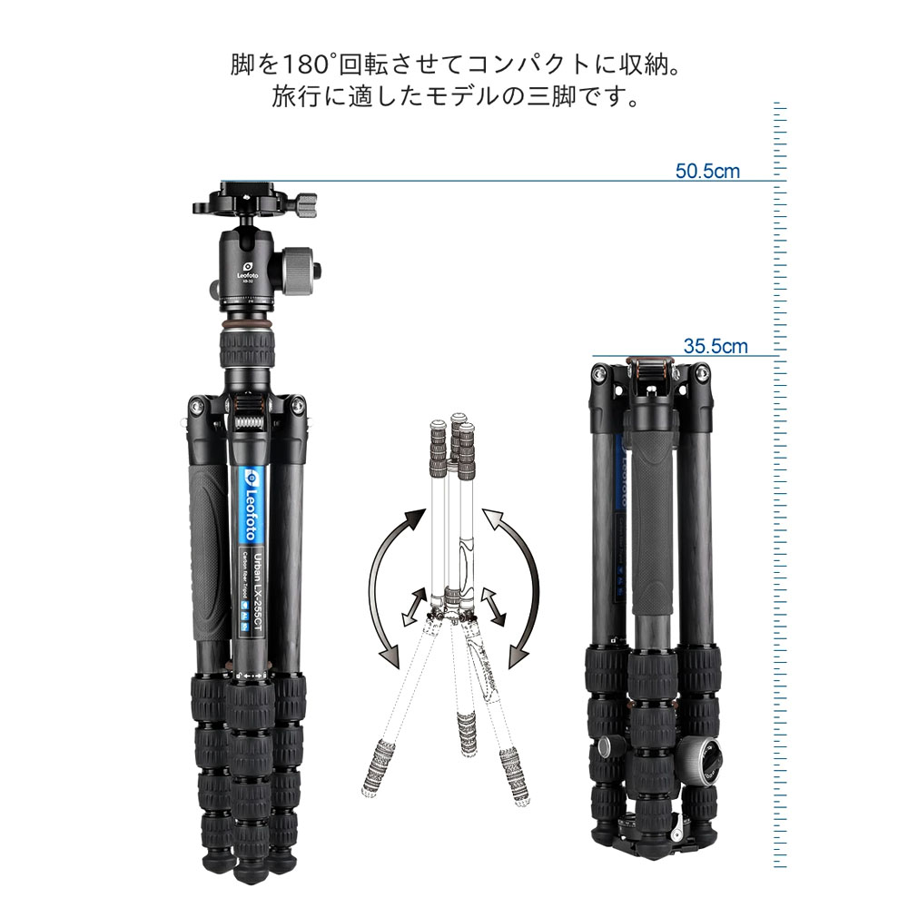 - 脚を180°回転させることでサイズを抑えて収納できるトラベラー三脚。