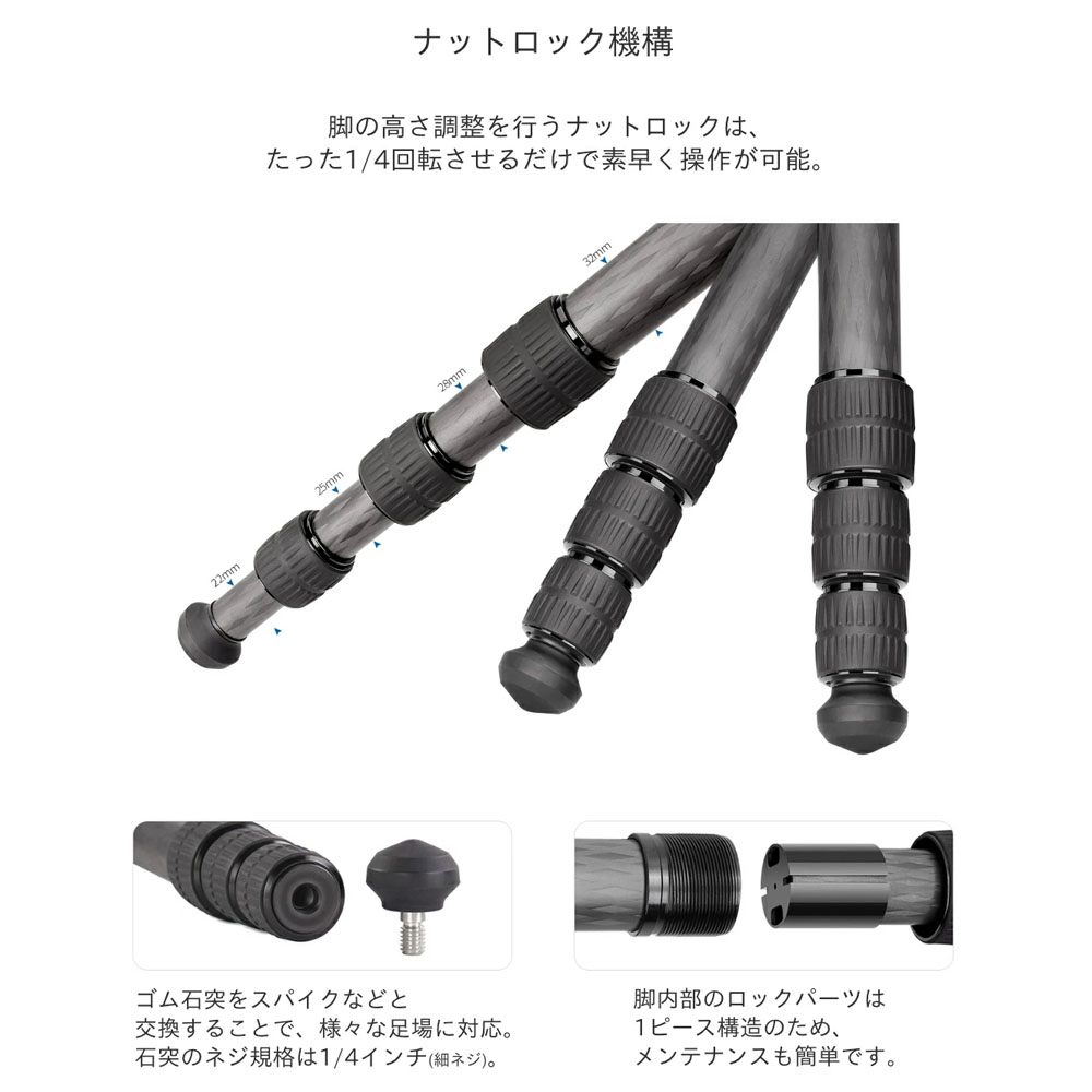 - アクセサリー取り付け用の1/4インチネジを装備。