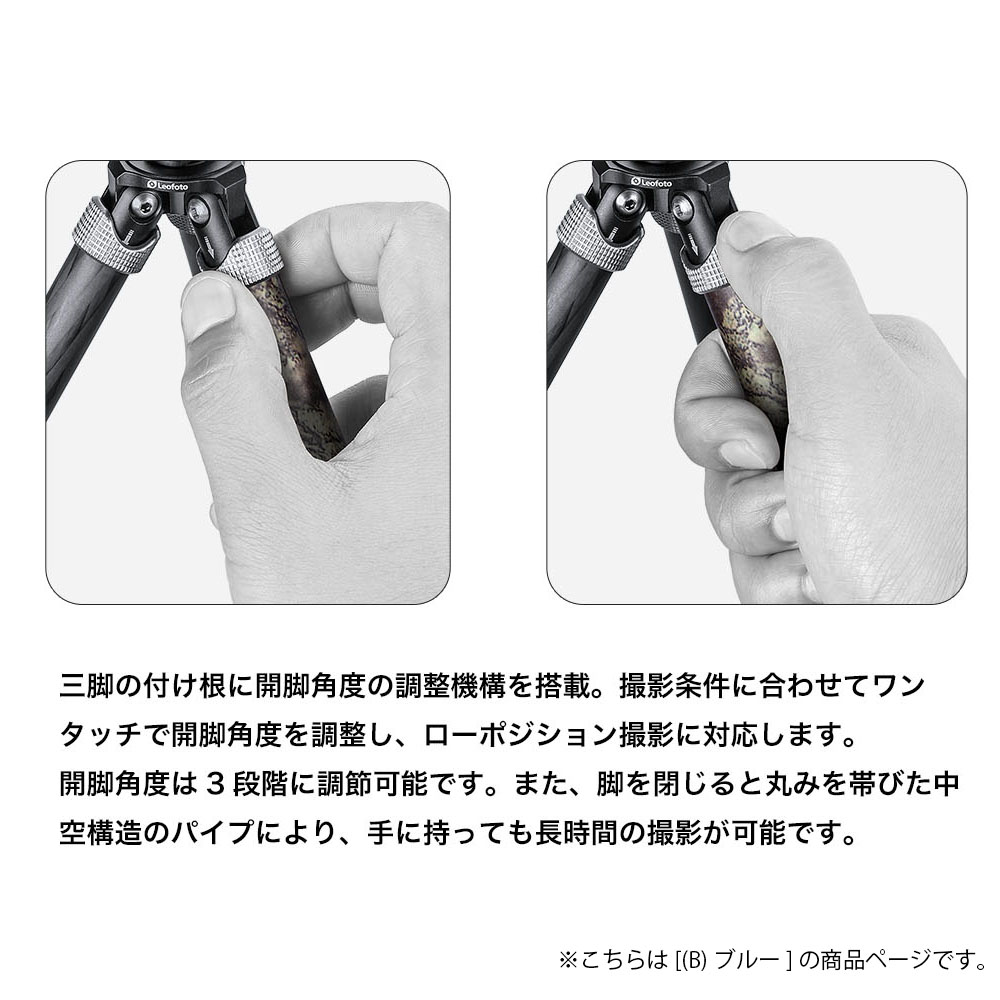 三脚の付け根に開脚角度の調整機構を搭載。撮影条件に合わせてワンタッチで開脚角度を調整し、ローポジション撮影に対応します。