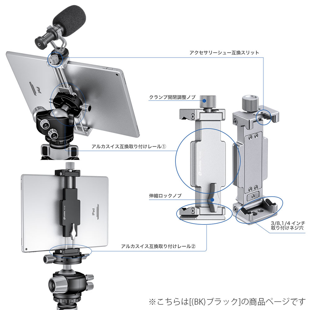 2カ所のアルカスイス互換レールに加え、3/8インチ、1/4インチネジ取り付け穴をそれぞれ装備。幅広い撮影機材に取り付けることが可能です。