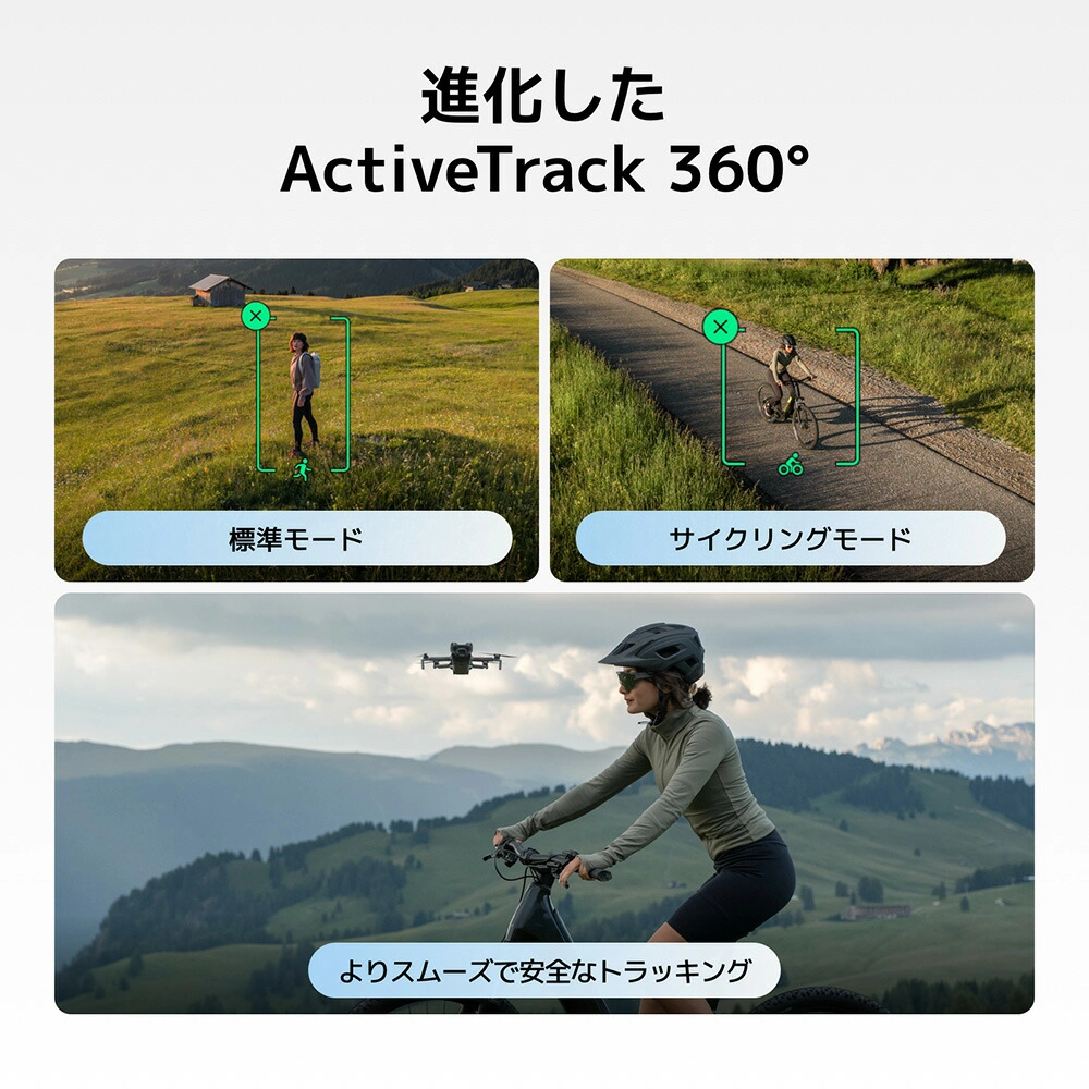 Mini 5 Proはスポーツシーンを検知し、最適なフレーミングのために自動でサイクリングモードまたは標準モードを選択します。さらに、速度、機動性、安全性のバランスを向上させたトラッキング機能を備えています。
