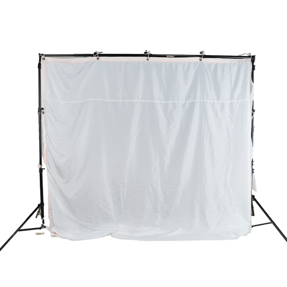 ロケの際にもスタンドやオートポールを使い紗幕を張る事が可能。 ストロボやHMI、外光をディフューズする事で、大きく柔らかい3.6mx3.6mの光源を作る事が可能。大きさも適度で持ち運びも楽です。 紗幕の周りに鳩目が等間隔でついていて、付属する紐で紗幕を張る事もできます。