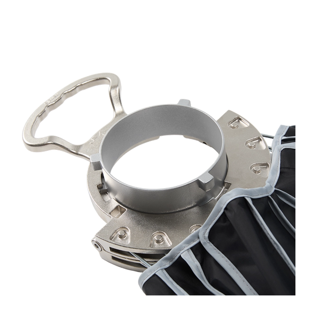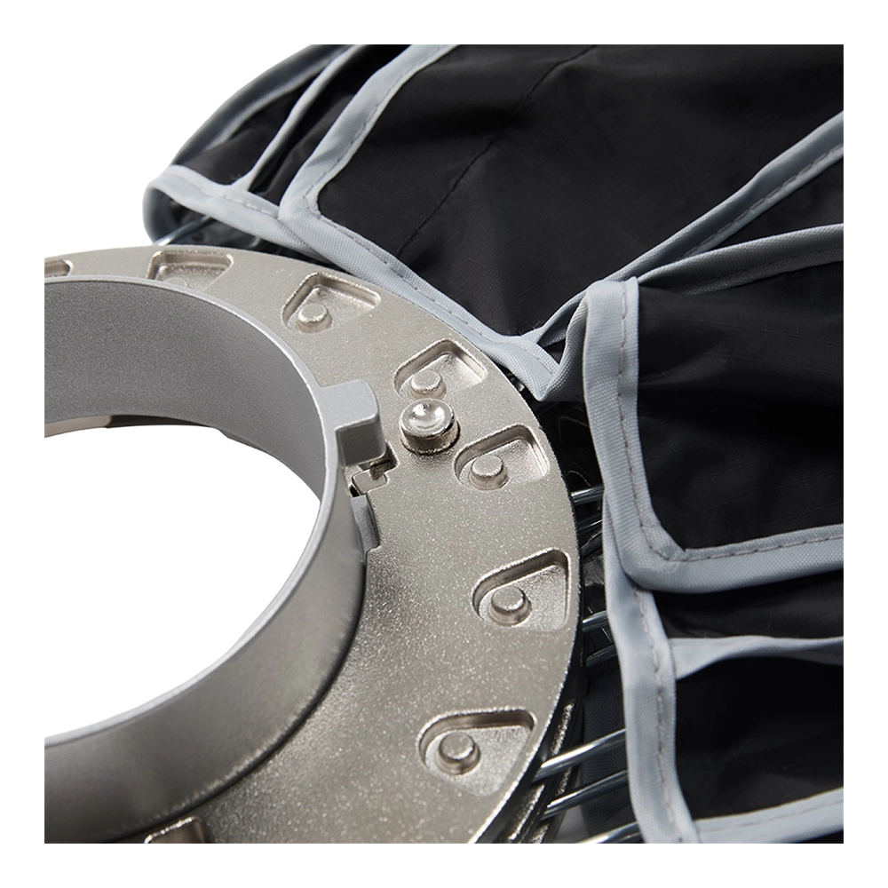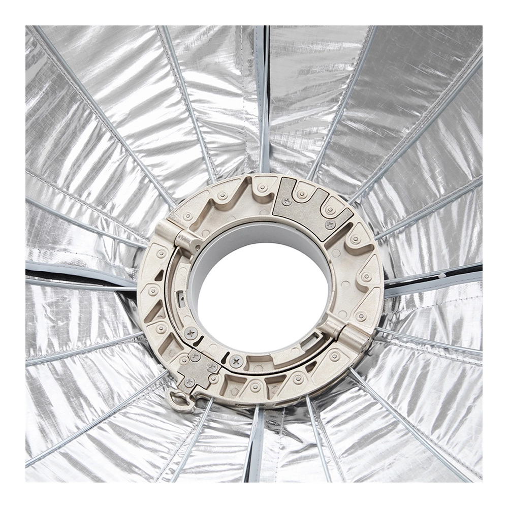 ライトドーム III】の後継機種になります。直径90cmの大型Bowensマウントソフトボックス。16本のスチールロッドを瞬時に固定できるクイックリリース構造を採用し、設置・撤収がスピーディーに行えます。深いパラボリック形状と高反射シルバー内面により、中心から端まで均一で力強いソフトライトを実現。2種類のディフュージョンクロス、インナーバッフル、40°グリッドを付属し、光の柔らかさと指向性を自在にコントロール可能です。