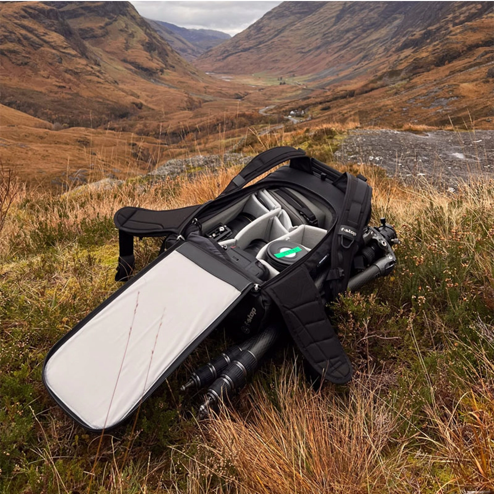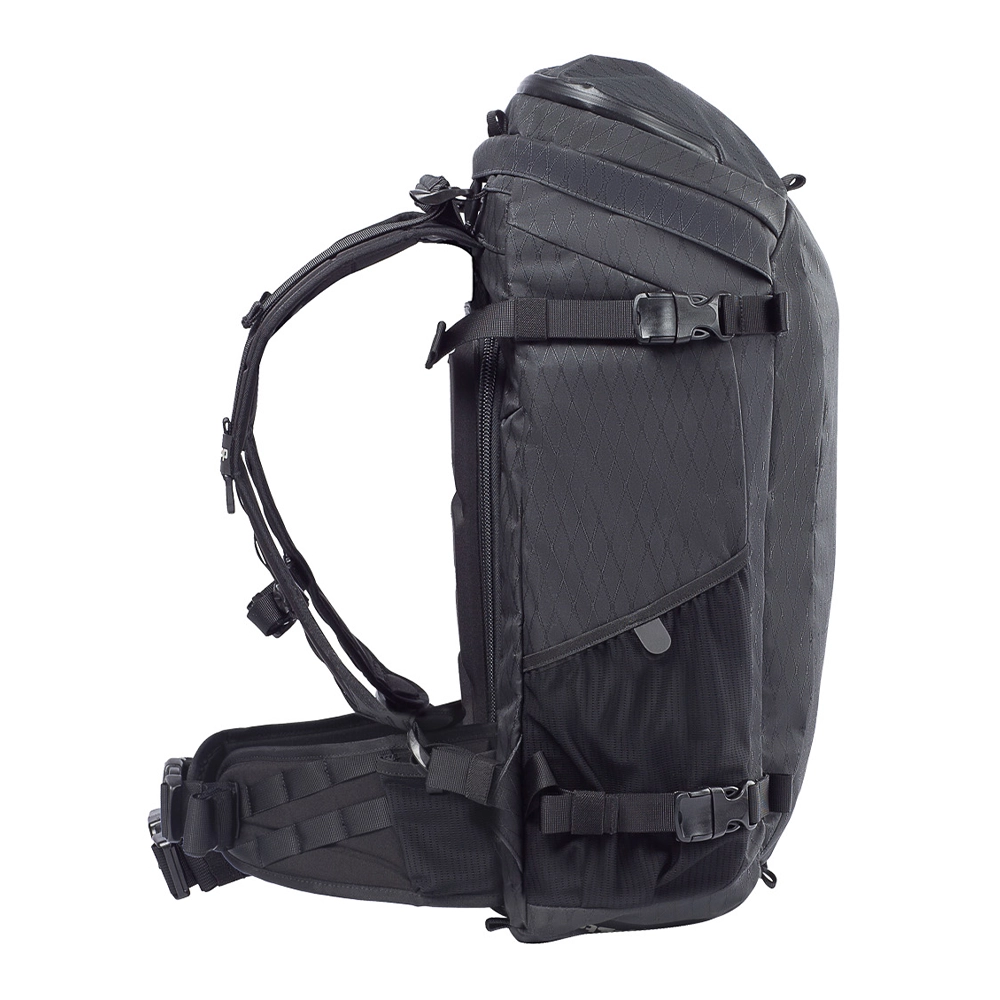 ICU(インターチェンジャブル・カメラ・ユニット)を収納できるメインコンパートメントに加え、トップリッド両側のジッパーポケット、背面外側の縦型ジッパーポケット、さらにヒップベルトにはジッパーポケットとドロップイン式スタッシュポケットを備えています。