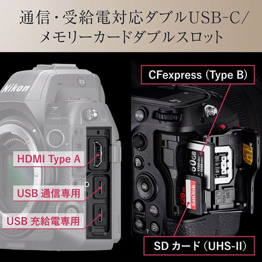 - CFexpressカード(Type B)、XQDカード、SDメモリーカード、SDHCメモリーカード、SDXCメモリーカード(SDHCメモリーカード、SDXCメモリーカードはUHS-II規格に対応)