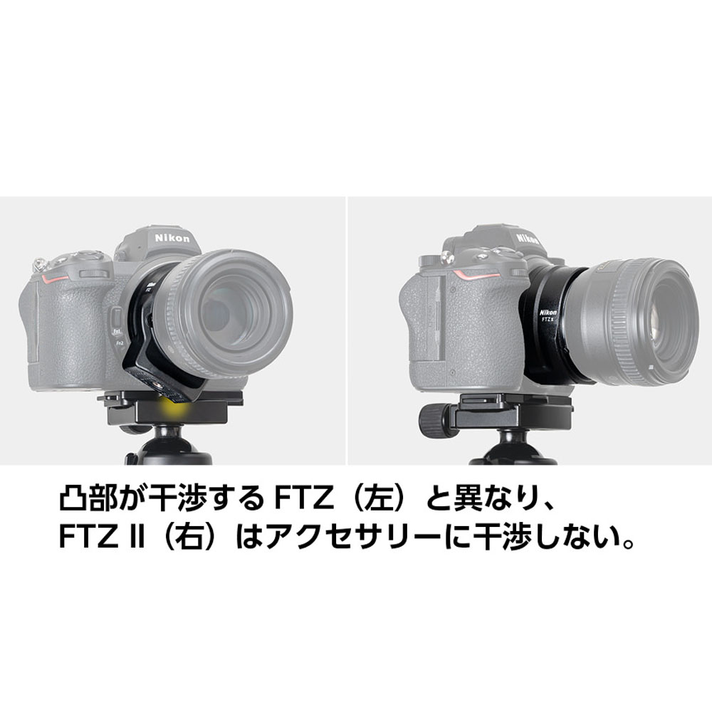 雲台やクイックシューに干渉することなくカメラボディーを三脚に固定できるので、三脚撮影時にもFTZ IIを装着したNIKKOR F レンズをそのまま着脱可能。NIKKOR Z レンズ ⇔ NIKKOR F レンズの交換がスムーズにできます。