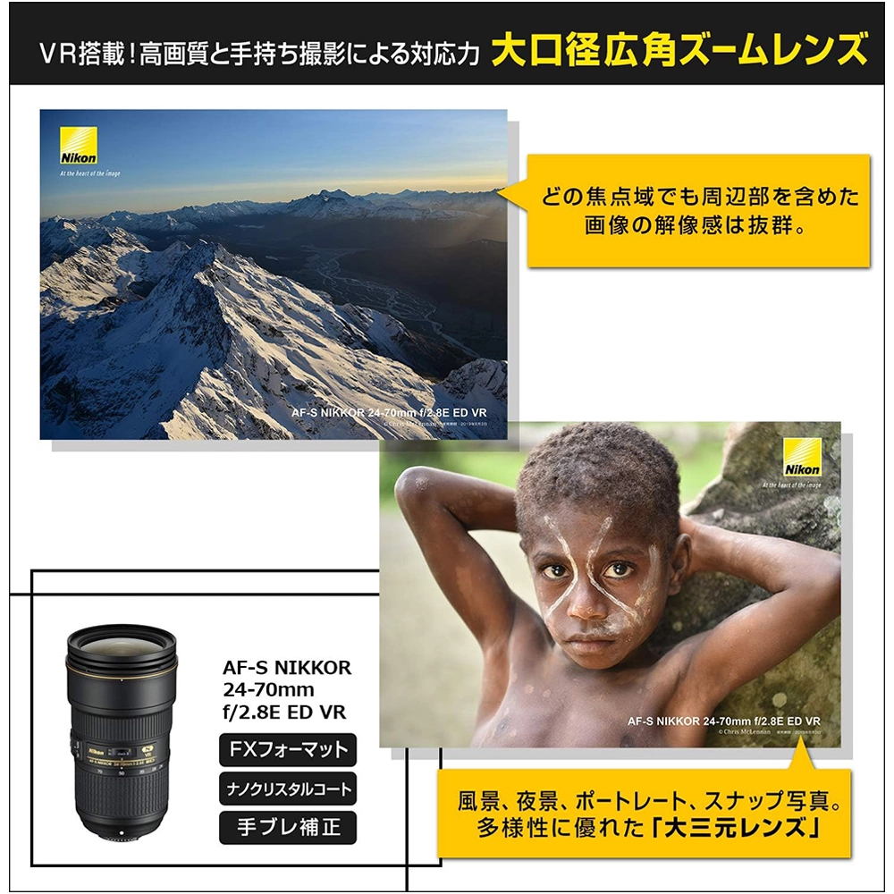 VR機構を搭載した、開放F値2.8一定で、焦点距離24-70mm(DXフォーマットデジタル一眼レフカメラ装着時はFXフォーマット・35mm判換算で36-105mm相当の撮影画角)の標準ズームレンズです。世界最高クラスの画質を追求した最新の光学設計に、手ブレ補正効果4.0段(CIPA規格準拠)のVR機構を新たに搭載。ハードな使用環境を想定した高い堅牢性も備えています。広角から中望遠までの焦点域をカバーしており、報道、広告、スポーツ、ファッション、ブライダル、風景など、多彩なシーンで活躍。プロフェッショナルが求める描写力と高度な仕様を兼ね備えた、高性能大口径標準ズームレンズです。