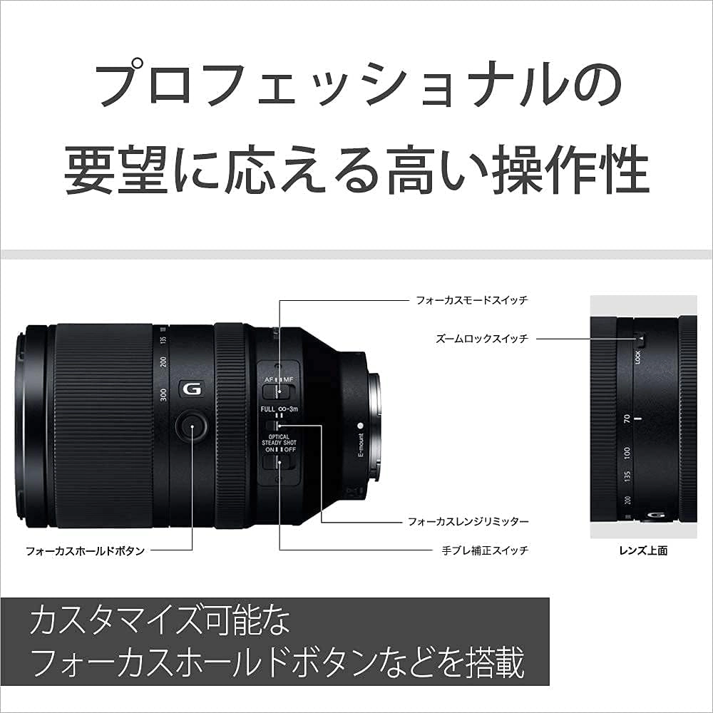 Eマウント35mmフルサイズ対応で300mmまでの望遠域をカバーする高解像望遠ズームレンズです。非球面レンズ4枚とEDガラス2枚、ナノARコーティングの採用により、諸収差を良好に補正しながら中心から周辺まで高解像を実現。ワイド端だけでなくテレ端でも高い解像力を誇ります。さらに、最短撮影距離0.9m、最大撮影倍率0.31倍の優れた近接撮影能力により、望遠撮影だけでなくテレマクロ撮影にも対応。フォーカス駆動にはリニアモーターを採用し、望遠ズームレンズでありながら高速かつ静粛性に優れた動作を実現しています。