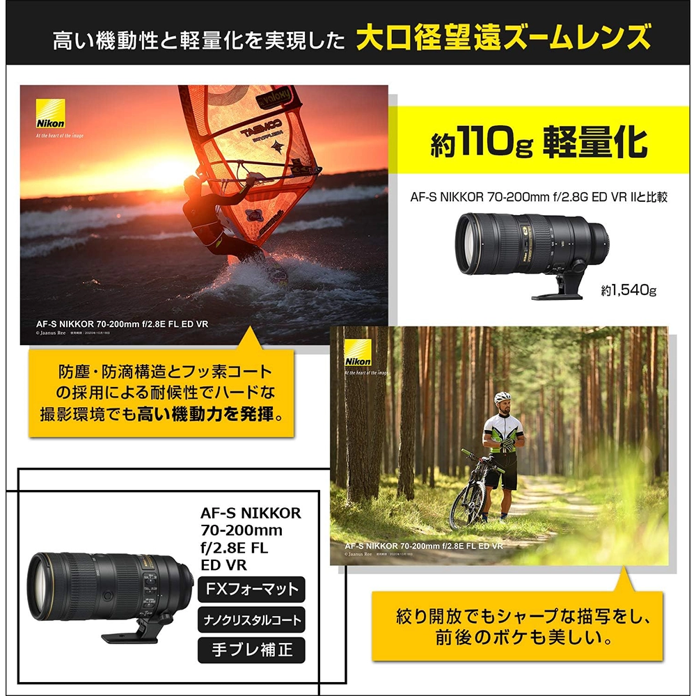 防塵・防滴構造とフッ素コートの採用による耐候性とレンズの軽量化により、ハードな撮影環境でも高い機動力を発揮。手ブレ補正効果4.0段(CIPA規格準拠)のVRモードには、動く被写体を追いやすい[SPORT]モードも搭載。電源投入直後のVR性能の大幅向上、不規則に動く被写体へのAF追従性の向上、電磁絞り機構による高速連続撮影時でも安定した露出制御など動体撮影のための最新テクノロジーを搭載しています。また、最短撮影距離が1.1mと短く、クローズアップ的な表現も可能。さらに、ホールディング性の向上や4つのフォーカス作動ボタンなどの装備によりスムーズな操作性を追求しています。蛍石レンズ、高屈折率レンズ、EDレンズ、ナノクリスタルコートの採用で画像周辺部まで卓越した描写性能が得られます。