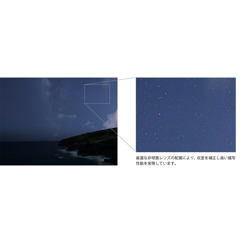 夜景や星空の撮影において、画面周辺部にある点光源の像が鳥が羽を広げたような形状になるサジタルフレアは、特に大口径レンズで発生しやすい収差の一つです。本レンズでは非球面レンズを最適に配置することにより、画面周辺部においても、滲みや歪みのない高い描写性能を発揮します。