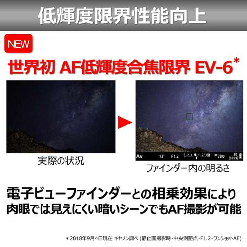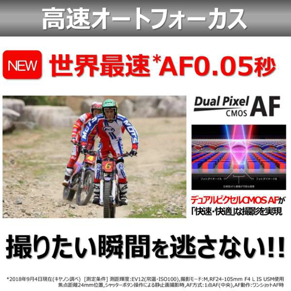 各画素が撮像と位相差AFの両方を兼ねる「デュアルピクセルCMOS AF」と「RFレンズ」の駆動制御を最適化したことにより、最速約0.05秒の高速AFを実現。AFエリア任意選択時は、撮像面の約100%(縦)×約88%(横)の範囲で、ピントを合わせたい場所を最大5,655のポジションから選べるため、自由な構図で撮影できます。さらに、EOSシリーズで初となるEV-6の低輝度限界を達成し、肉眼では被写体の判別が難しい暗い状況でも高精度なピント合わせを実現しています。
