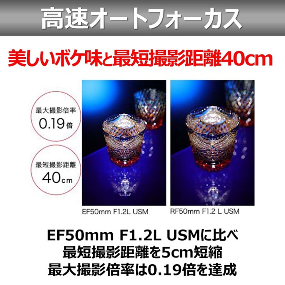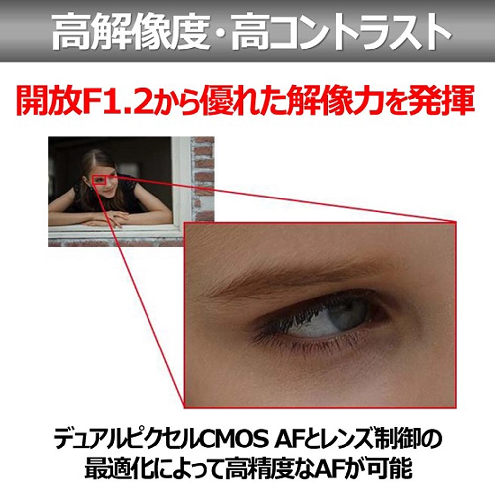 大口径マウントと最新の光学設計により、各種収差を良好に補正。開放F1.2から画面全域で高解像度・高コントラストを発揮します。デュアルピクセルCMOS AFとレンズ制御の最適化によって高精度なAFが可能。被写界深度が浅く狙ったところにピントを合わせるのが難しい状況でも快適に撮影ができます。