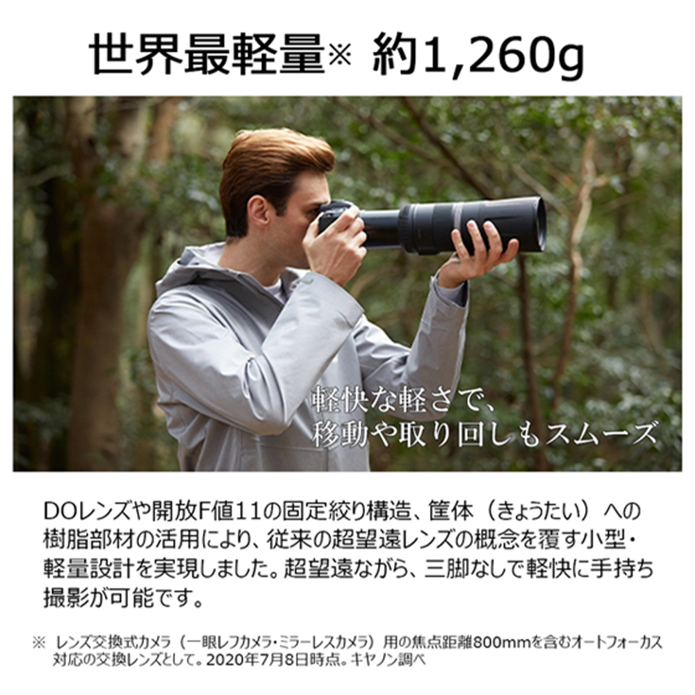 ※ レンズ交換式カメラ(一眼レフカメラ・ミラーレスカメラ)用の焦点距離800mmを含むオートフォーカス対応の交換レンズとして。2020年7月8日時点。キヤノン調べ。