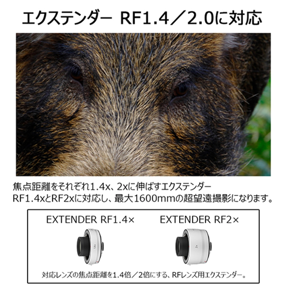 焦点距離をそれぞれ1.4x、2xに伸ばすエクステンダー RF1.4xとRF2xに対応し、最大1600mmの超望遠撮影になります。