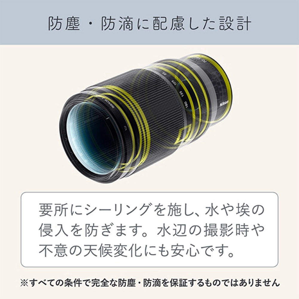 ニコンが長年培ってきたユーザビリティーへのこだわりを外観デザインに反映しています。ズームリングのローレットゴム部とレンズ前面の直進筒の間にスペースを設けることで、ズームリングと直進筒の間に指を挟まりにくくしています。焦点距離を70mmにして、[LOCK]にセットすると、ズームリングをロックできるズームロックスイッチは、レンズをしっかりとホールドしたまま左手の指で操作できる箇所に配置。持ち運び時やカバンへの収納時に不用意にレンズが繰り出すのを防げます。