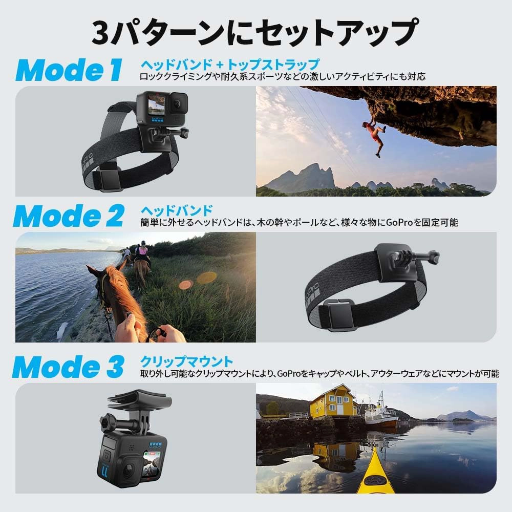 ヘッドストラップ2.0は、3パターンにセットアップできるモジュラー設計。激しいアクティビティは、トップストラップと組み合わせてしっかりとサポート。軽めのアクティビティなら、ヘッドバンドだけを使えば邪魔にならずに撮影できます。クリップマウントは取り外し可能で、GoProをキャップやベルトなどにマウントすることが可能。ヘッドバンドも様々な物にGoProを固定でき、あらゆるシーンで撮影の自由度を高めます。