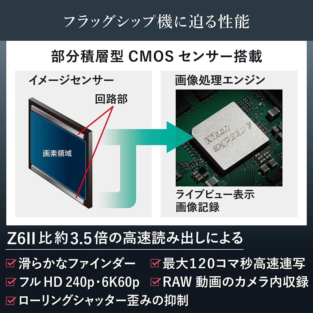 撮像部の上下に高速処理回路を積層配置した部分積層型CMOSセンサー。読み出し速度がZ6IIの約3.5倍と非常に速く、最大約120コマ/秒の静止画撮影や、フルHD 240pの動画撮影、さらに6K 60pのN-RAW動画のカメラ内記録なども可能です。また、すべての撮影モードでローリングシャッター歪みを抑えた撮影が可能。さらに、EVFのリフレッシュレートも最大120fpsまで向上しており、約20コマ/秒の高速連続撮影(拡張)時にも表示とびを最小限に抑えた、リフレッシュレート60fpsの滑らかなファインダー像(電子シャッター時)で被写体の動きを追うことができます。しかもAFは、EXPEED 7との連携によるZ6IIよりも約20%速い合焦速度を実現。動きの速い動物の撮影でもシネマティックな動画撮影でも、かつてないほどの創造力を発揮できます。